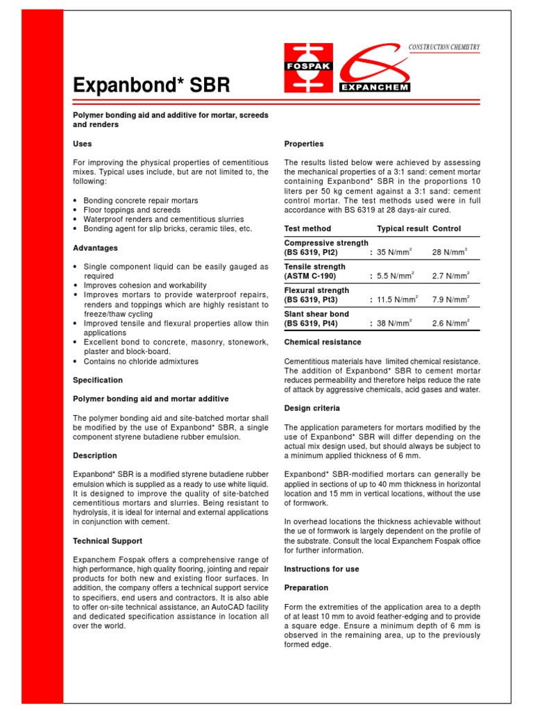 Sbr polymer modified screed includes a synthetic polymer resin to give increased toughness and bond properties.